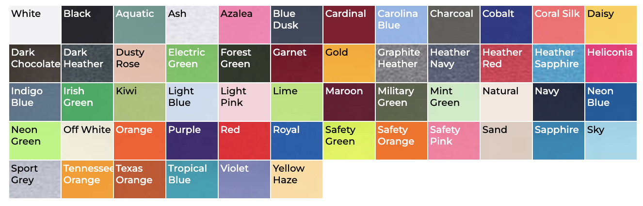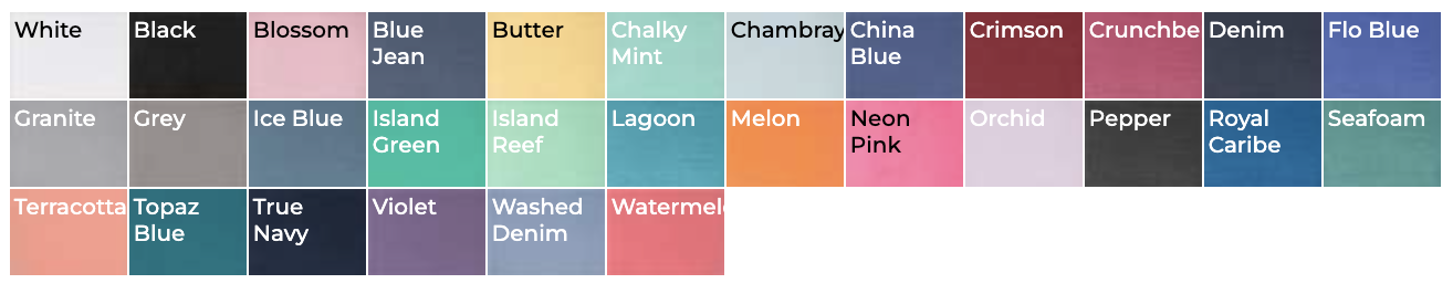 | Color | White, Comfort Colors Chambray, Gildan Sky, Comfort Colors Blossom, Gildan Light Pink |